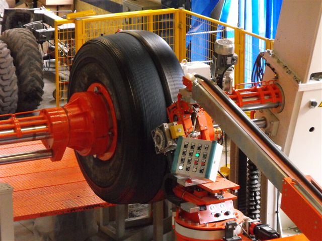 | 3. SIRT SARMA : Sırt sarımına hazır hale gelmiş lastik, sarma makinesine takılıp 60-70 derece ile ısıtılıp extruderden geçirilen kauçuk, sırt sarmadaki presin (enjeksiyon) yardımıyla lastiğin üzeri istenilen diş derinliğine göre sarılır. | |