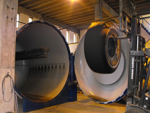 | 4. OTOKLAV İLE PİŞİRME : Sırtı sarılan lastikler otoklava yerleştirilir. Otomatik olan otoklav kapağı kapatılıp 140 derece buhar verilerek lastiğin kauçuk ile birleşmesi sağlanır. | |
